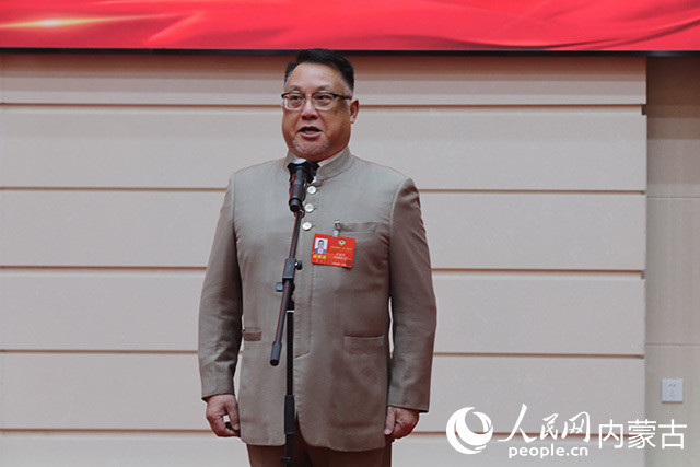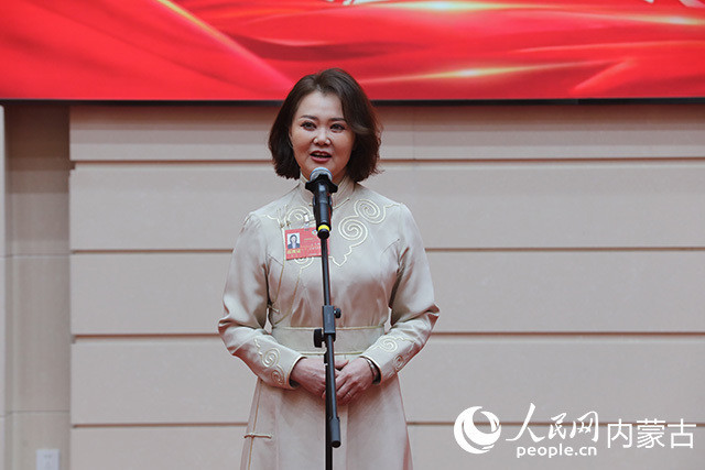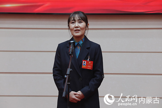 自治区政协委员,鄂温克族自治旗政协副主席安青梅在“委员通道”答记者问。人民网记者 李睿摄