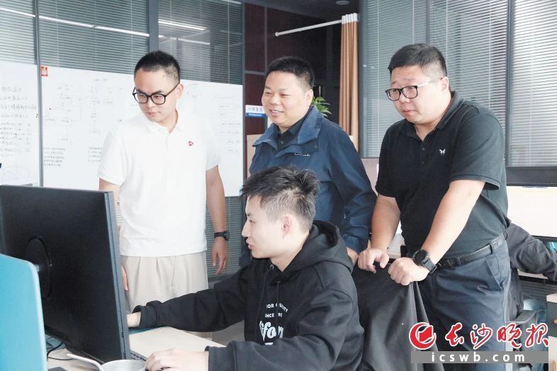 湖南归途信息科技有限公司创始人团队成员郑雨天(站立者左一)、李辉(站立者左二)、魏新(站立者左三),正在与技术人员沟通产品技术细节。林暘 摄